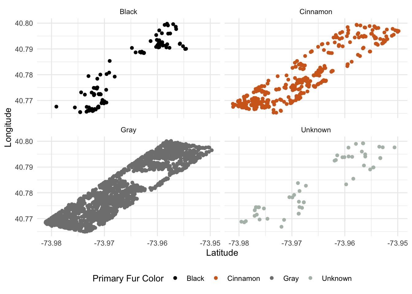 squirrel_by_col<- squirrels %>% select(x,y,primary_fur_color) %>% mutate(primary_fur_color = if_else(is.na(primary_fur_color),"Unknown",false = primary_fur_color))